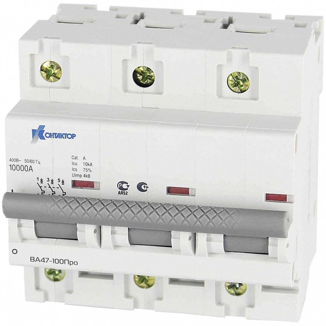 Выключатели ВА47-100Про предназначены для проведения тока в нормальном режиме и отключения тока при коротких замыканиях, перегрузках, а также для нечастых оперативных включений и отключений электрических цепей и рассчитаны для эксплуатации в электроустановках с номинальным напряжением до 400 В переменного тока частоты 50 Гц.